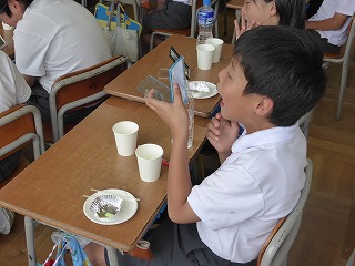 子どもたちは興味心身で手鏡に映る自分の歯を観察していました。