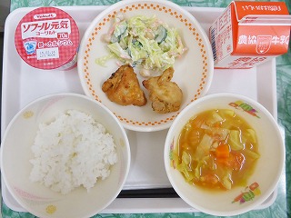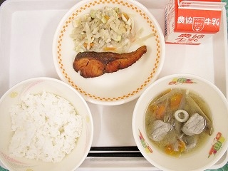 ごはん、ぶりのいしる風味揚げ、あいまぜ、みそだんご汁、牛乳