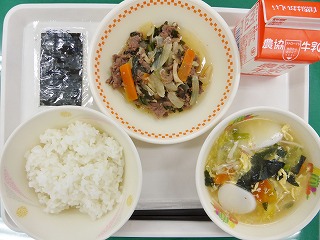 ごはん、プルコギ、トックスープ、韓国のり、牛乳