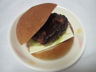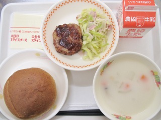 セルフバーガー(ハンバーグ、野菜ソテー)、クラムチャウダー風スープ、スライスチーズ、牛乳