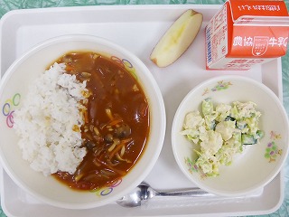 ビーフストロガノフ、オリヴィエサラダ、りんご、牛乳