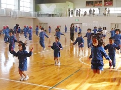 まずはクラス選抜者による難易度の高い技の披露があり、その後、低・中・高学年に分かれて持久跳びに挑戦しました。