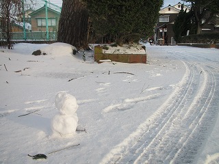 今朝出勤してくると、プール横に小さい雪だるまが置かれていました。