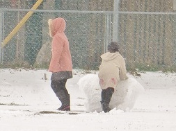 お昼休みには、久しぶりに運動場に積もった雪で巨大雪だるまをつくろうと奮闘する児童の姿も。