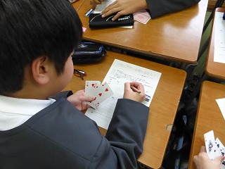 トランプを使った正の数・負の数の勉強に児童は大はしゃぎ。