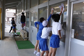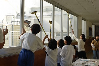 高いところは大人、低いところは児童と役割分担しながら、協力して窓をピカピカにしました。