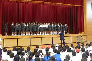昼休み、5年生が今週末に行われる「合唱のつどい」にむけて練習してきた曲を全校児童の前で披露してくれました。