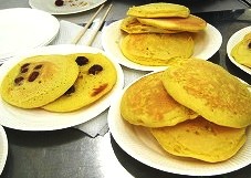 ホットプレートに生地を流し入れ,甘~い金時豆とチーズでトッピング。