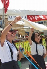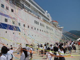 船が出航して紙テープから手が離れると、タオルをふりながら遠ざかっていく船を見つめていました。
