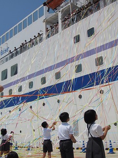 船から投げられる紙テープを手にニッコニコの児童たち♪