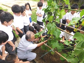 学級菜園にて2年生の植えた夏野菜がぐんぐん育っています。