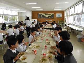 普段の給食はそれぞれのクラスごとに食べていますが、異学年どうしの交流と会食マナーの習得を目的として、異なる学年の2クラス程度が1週間交代で一緒に給食を食べます。