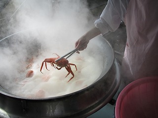 朝届けられたいきの良いカニを,給食室で塩ゆでにしました。