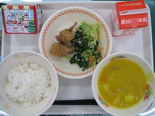 今日の献立は,牛乳,ごはん,フライドチキン,小松菜サラダ,かぼちゃのポタージュ,クリスマスケーキです。