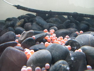 石川県水産総合センター生産部 美川営業所よりサケの受精卵200個がおくられ,1階西階段近くの水槽にやってきました。
