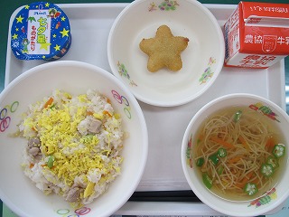 今日の給食では そうめんを天の川に、夏野菜であるオクラを