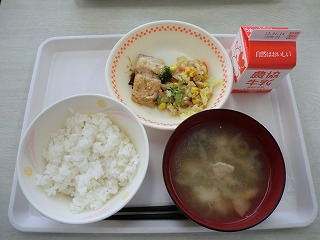 今日の給食は、ごはん、さごしのみそマヨ焼き、野菜サラダ、めった汁、牛乳でした!