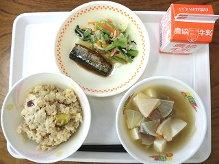 今日の給食は、さつまいもごはん、さんまの生姜煮、梅風味和え、みそ汁、牛乳でした!