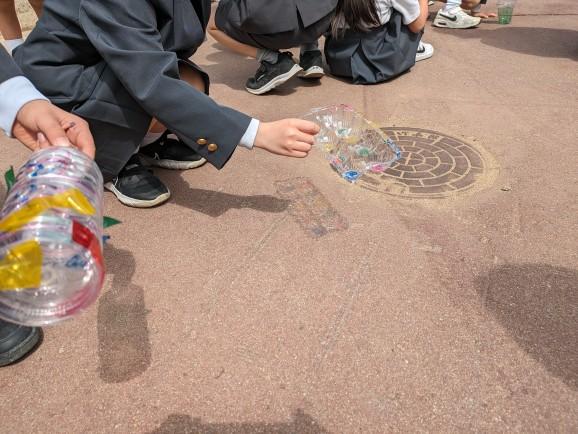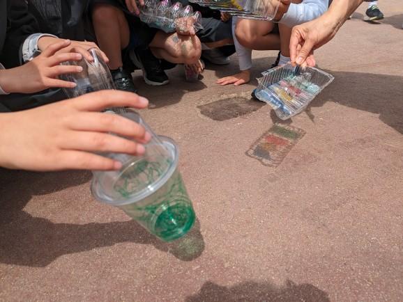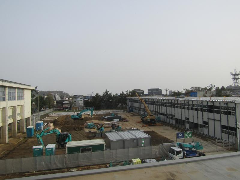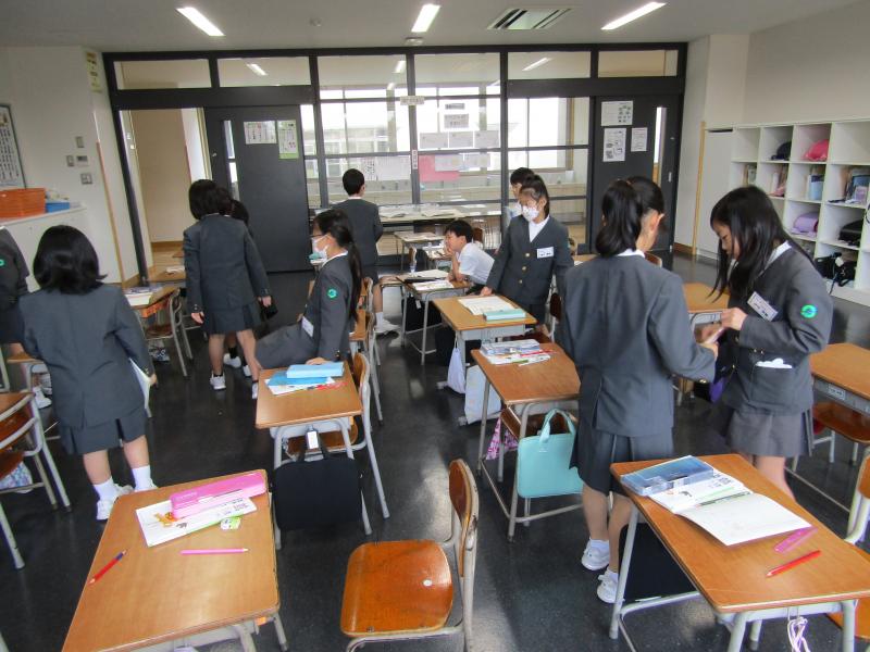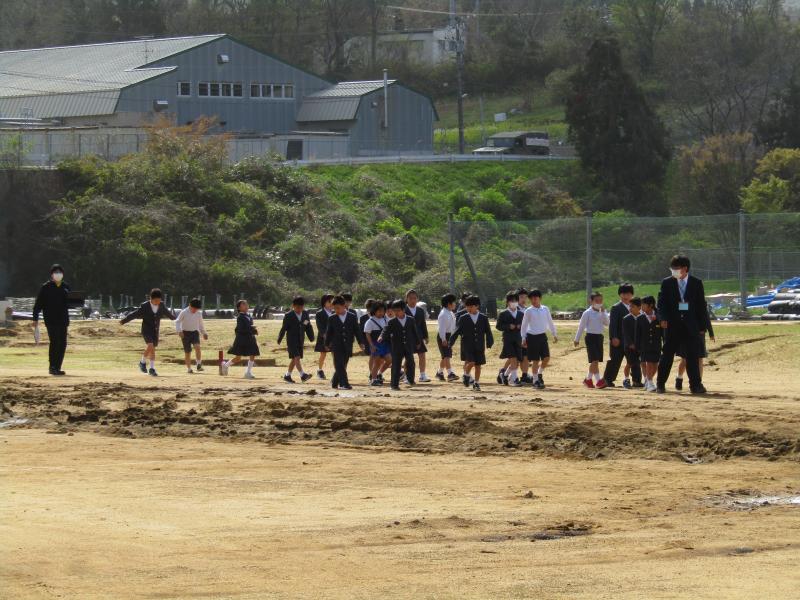 2年生が担任と輪島中学校の運動場の危険個所を確認しています。