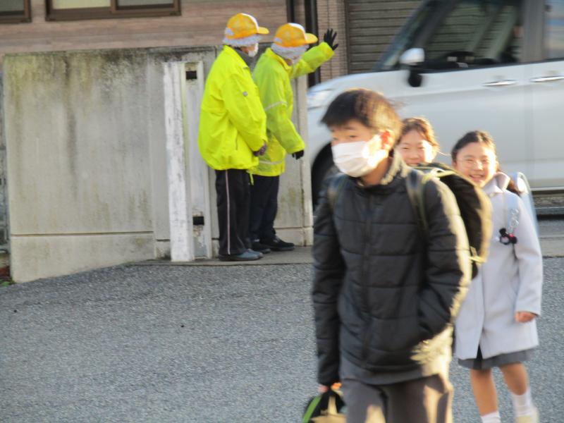 見守りボランティアのみなさんが挨拶で児童を迎えてくださいます。