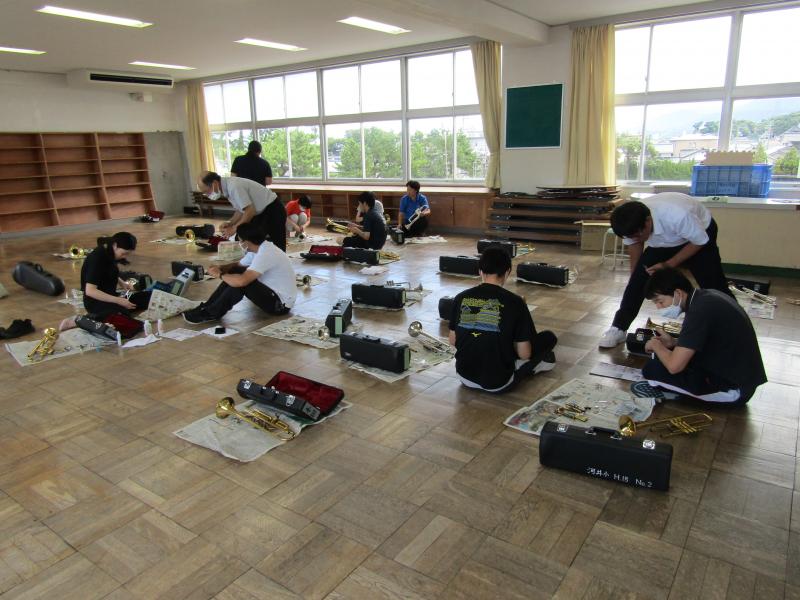 9:00からの校内研修後に洗浄した金管を職員が組み立てています。