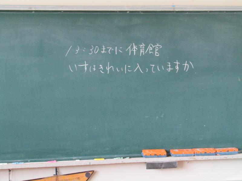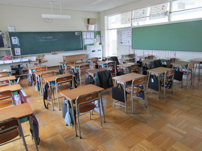 体育で誰もいない教室ですが、椅子が机に入れられています。