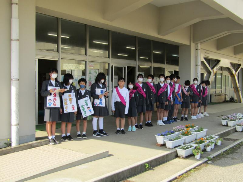 あいさつ運動は放送委員会・給食委員会のみなさんです。