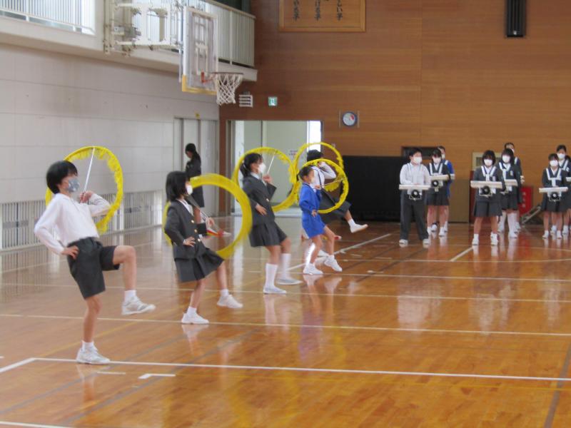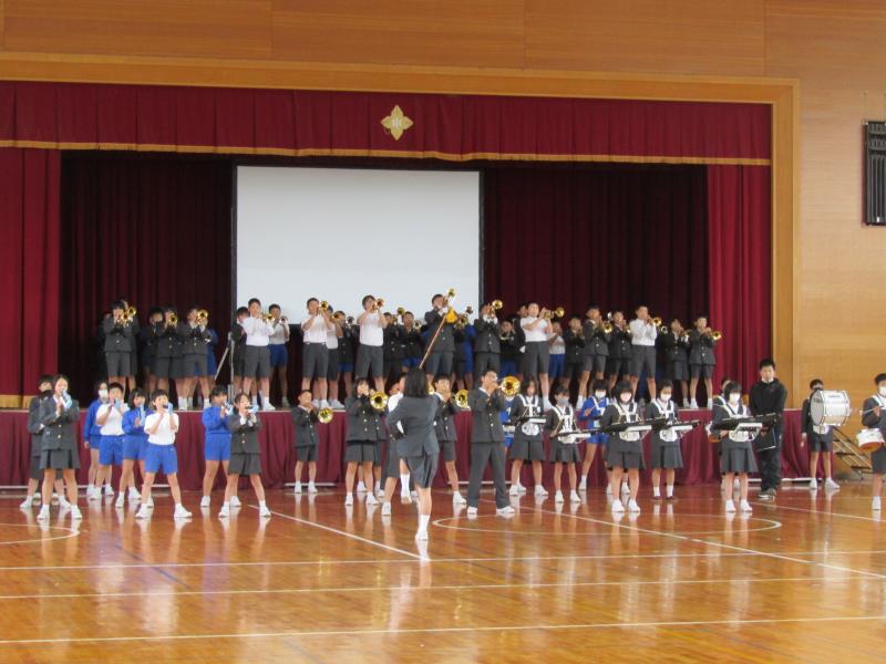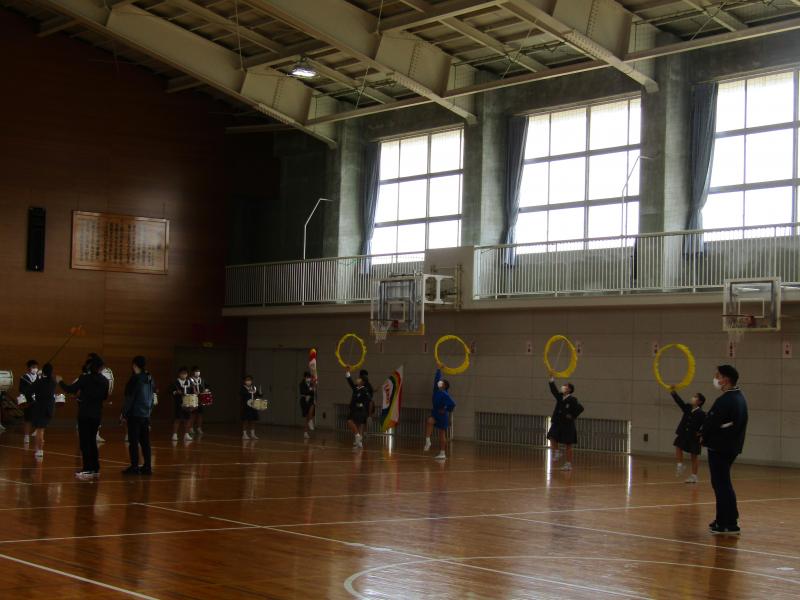 体育館で明日の1年生を向ける会に向けて金管鼓隊の練習がありました。