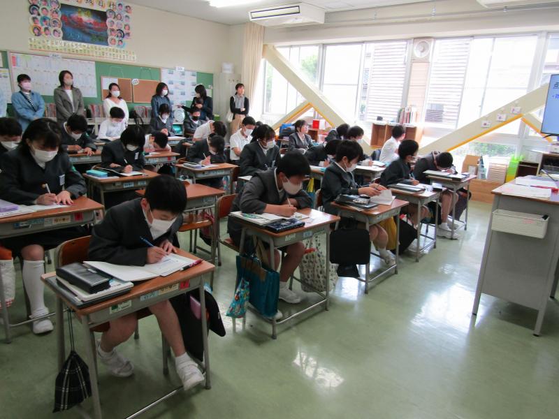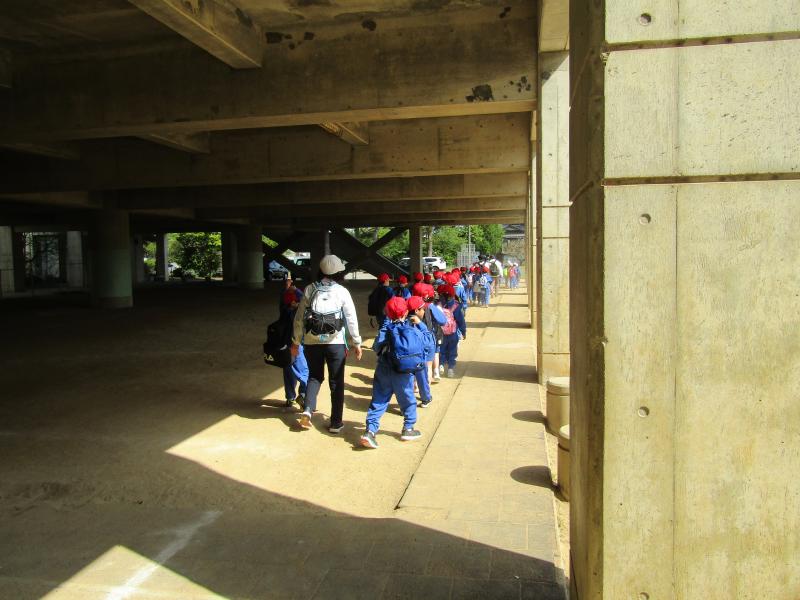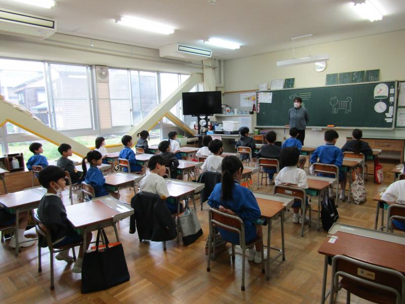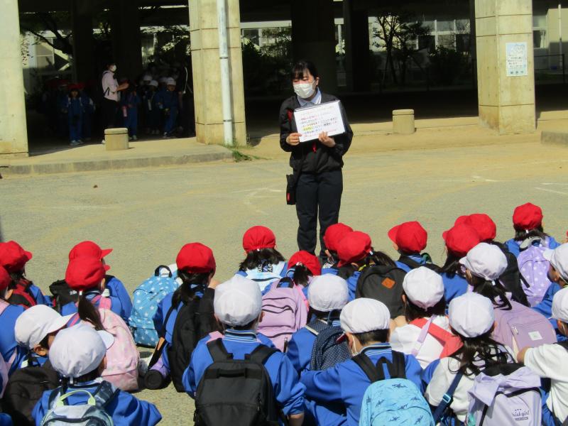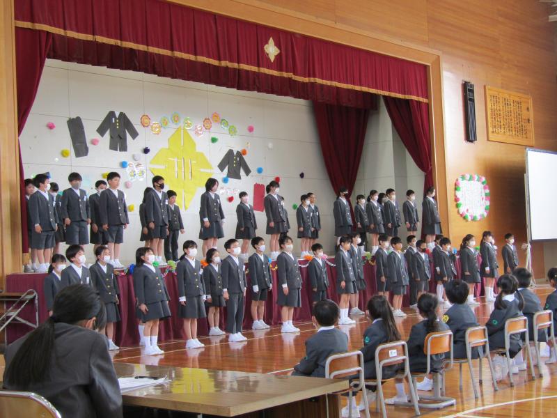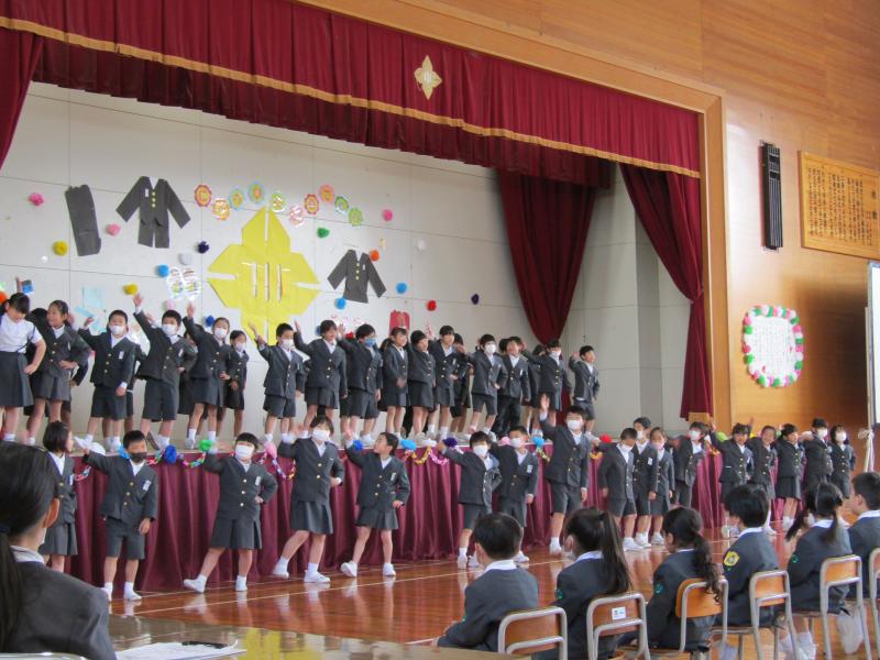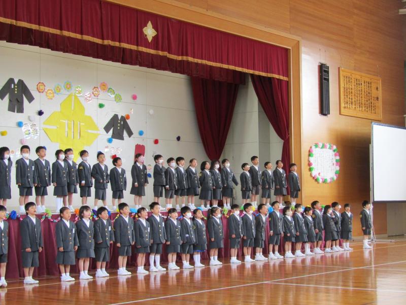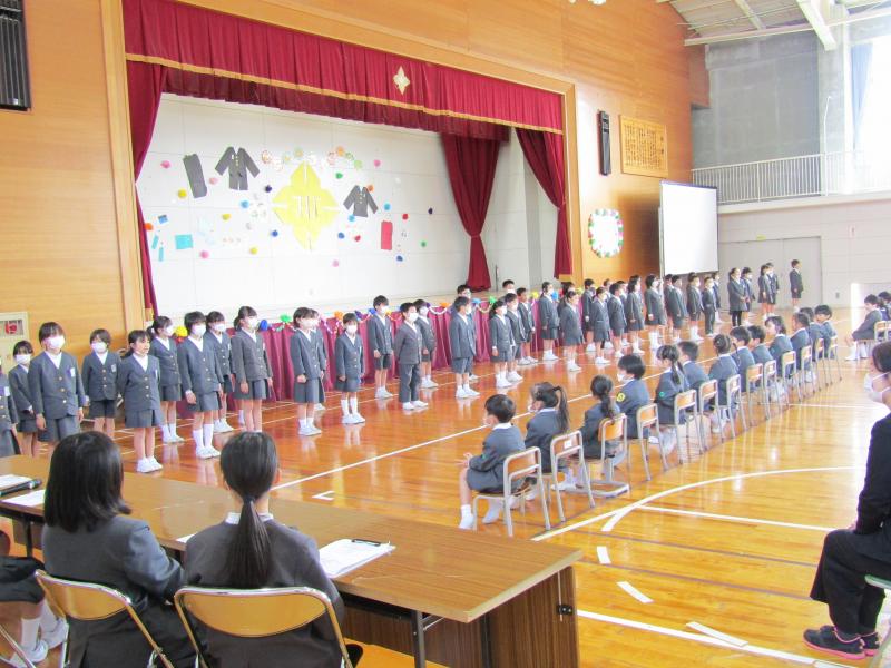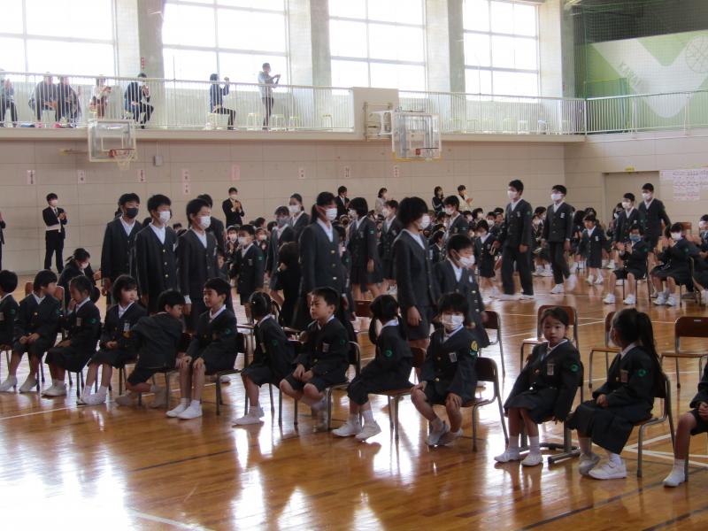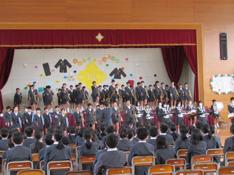 1年生が河井小金管鼓隊の演奏を初めて聞く日です。