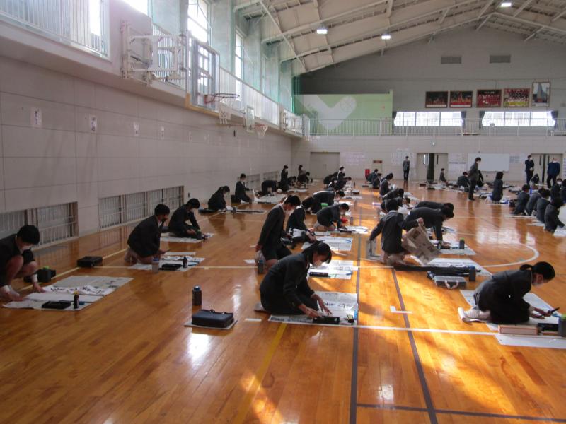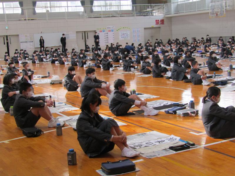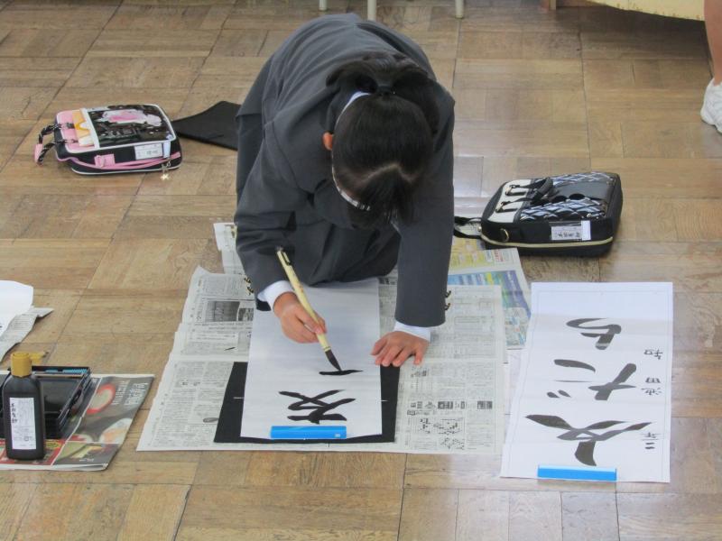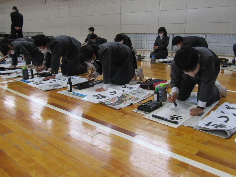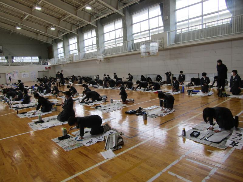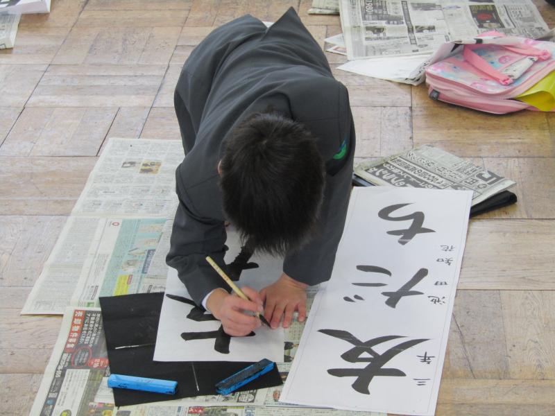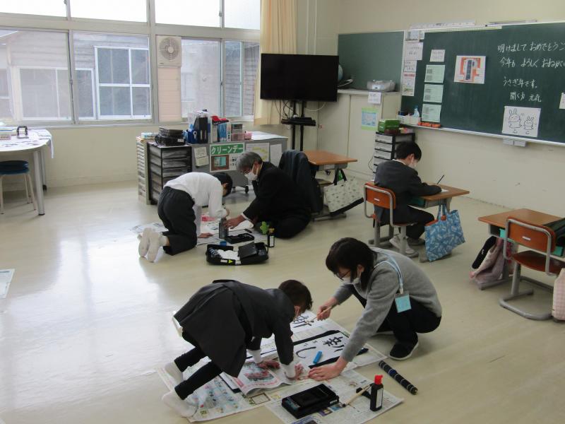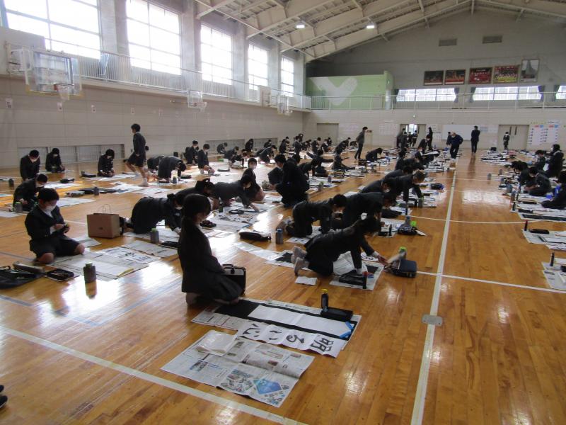 始業式の後、体育館で3~6年生が書き初めを行いました。