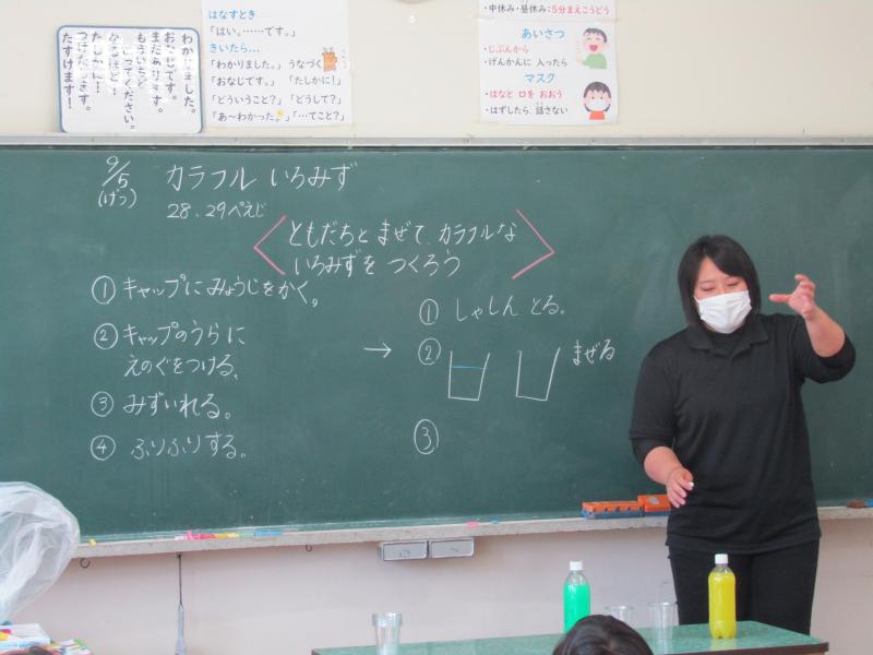 友だちと混ぜて新しい色を作ったり、ペットボトルを並べたりして表現します。