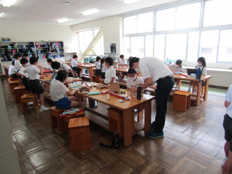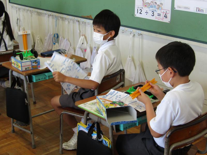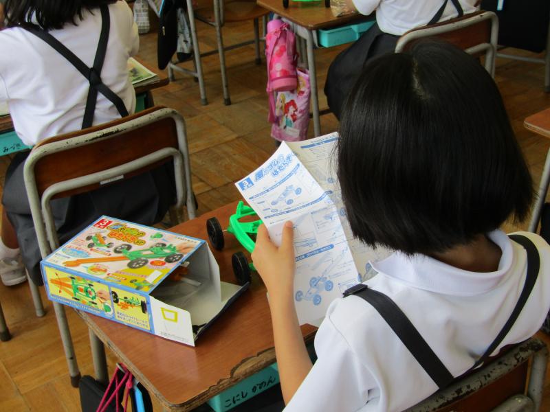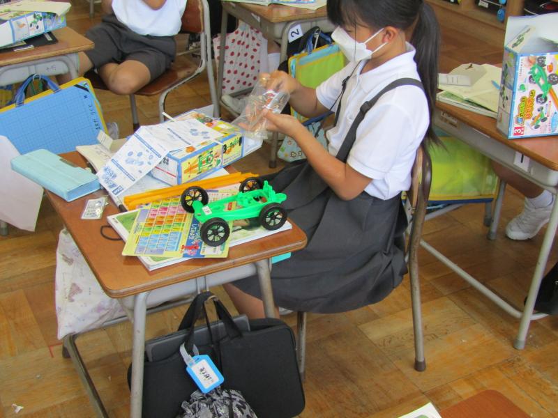 写真は風の力からゴムの力で動く車につくり変えているところです。