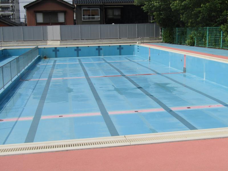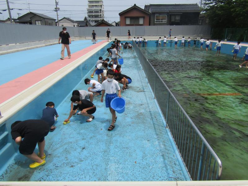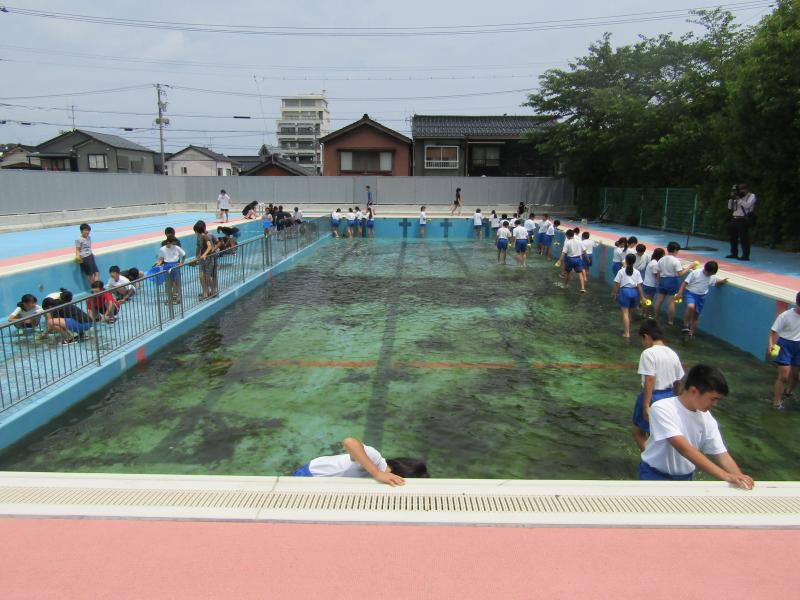 全校生が楽しみにしているプールを磨きます。