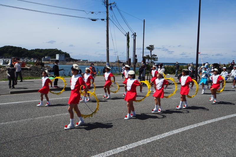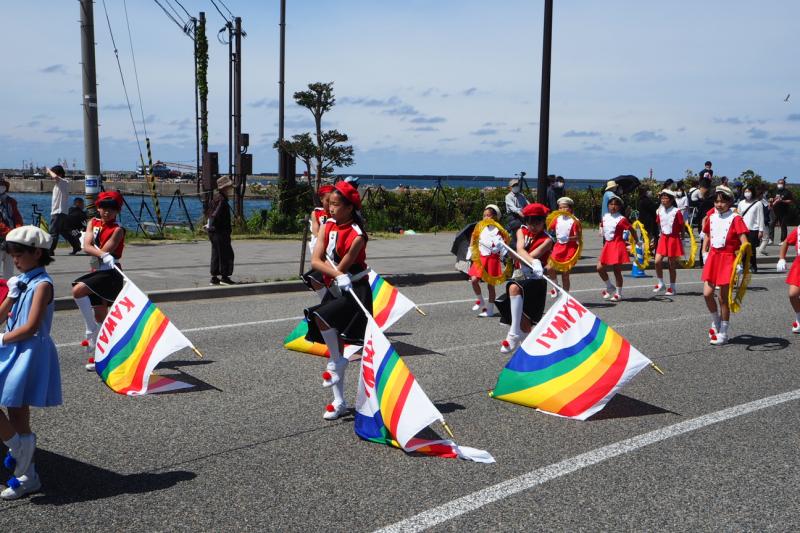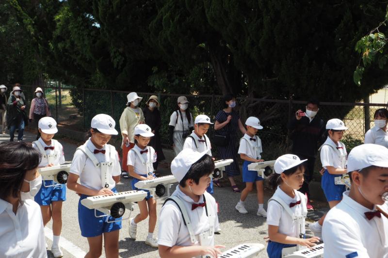 マリンタウンでの演奏の前に地域の方々へ感謝を込めてパレードを披露します。