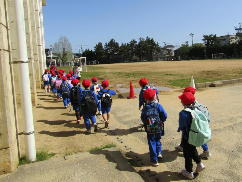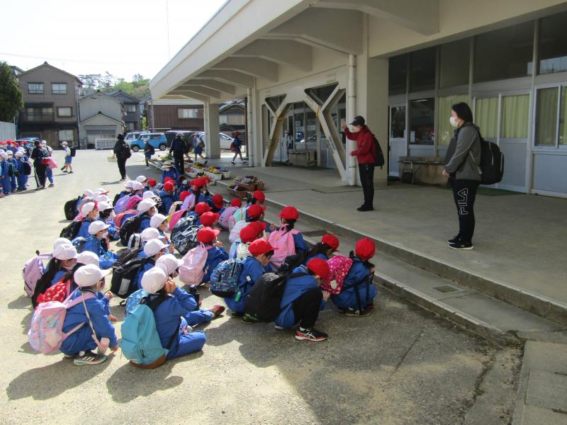 初めての遠足の1年生はしっかりと注意を聞いています。