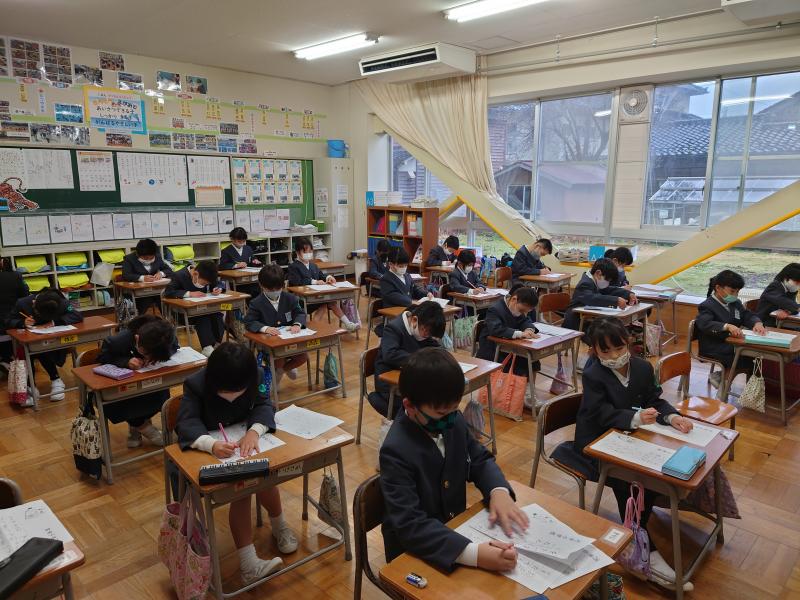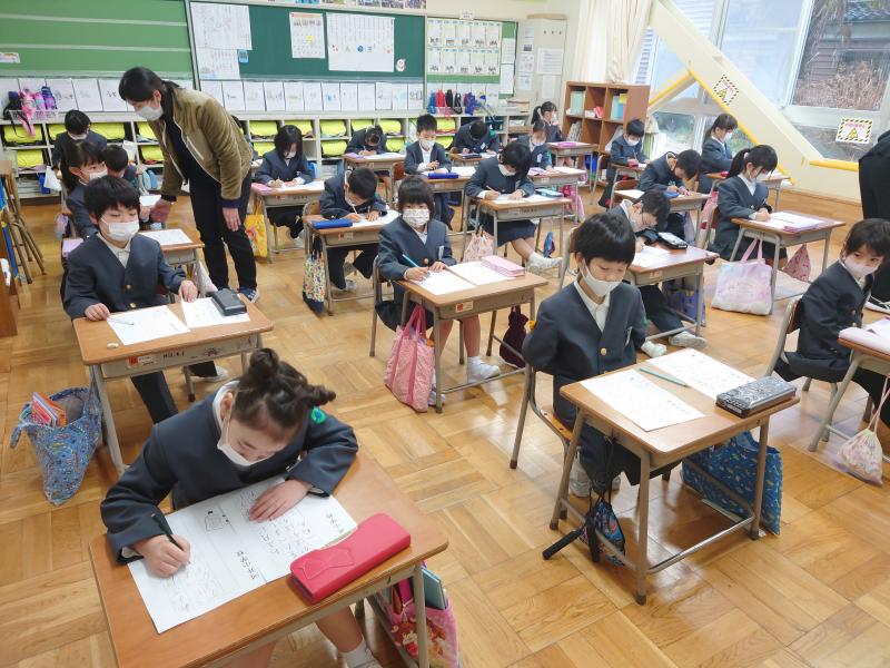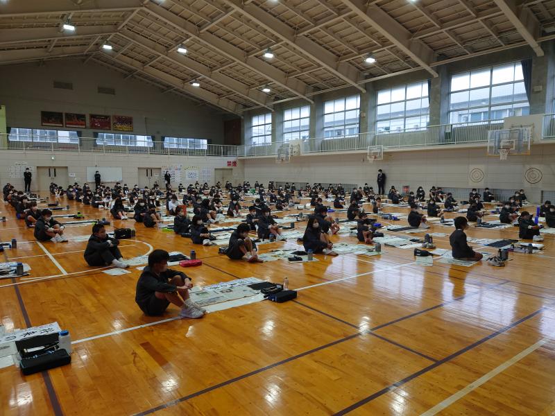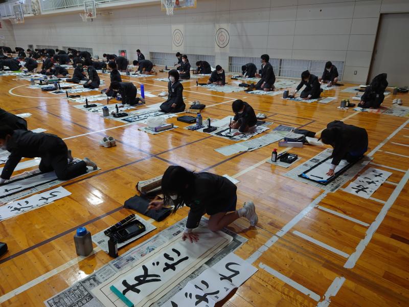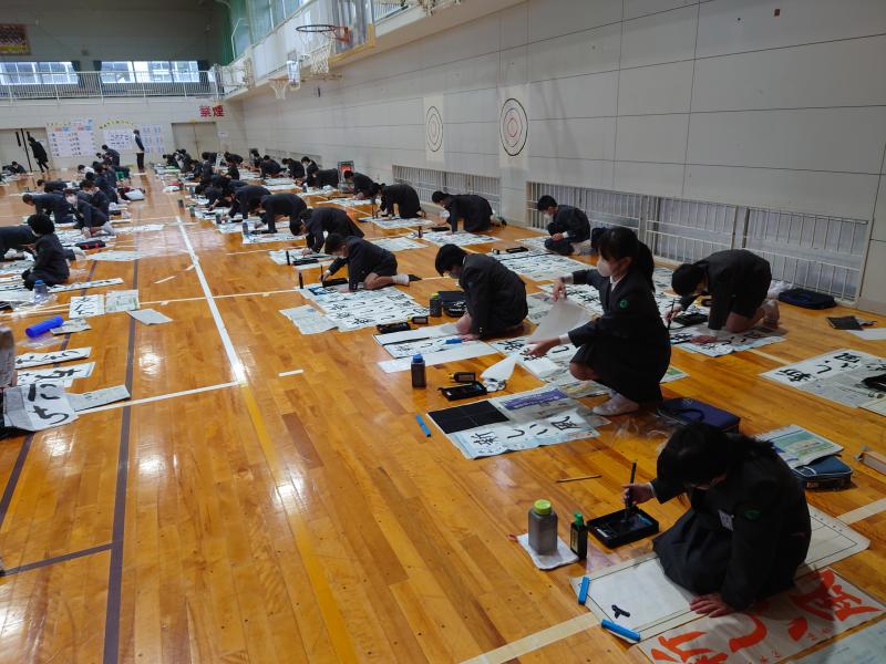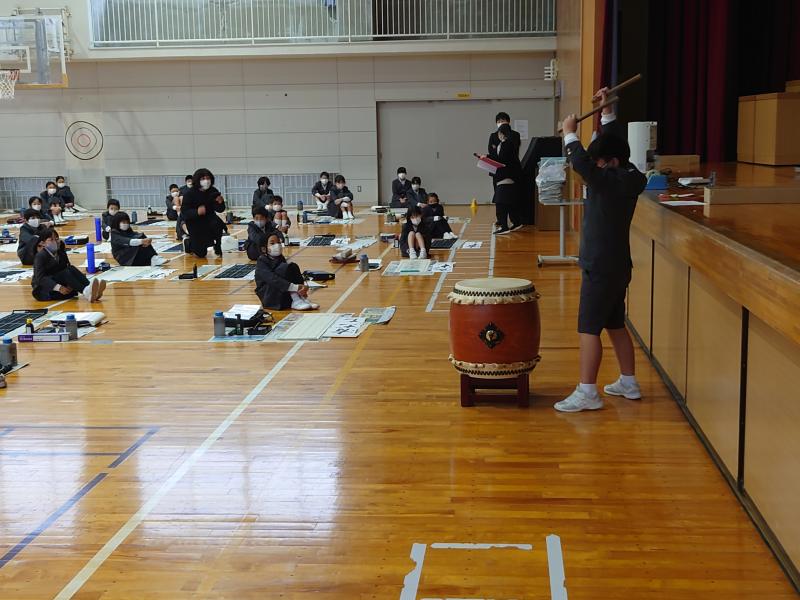 始業式の後、書き初め大会が行われました。書き初めは、新年の目標や抱負を書いたり、字の上達を祈念したりして行われてきました。この書き初めの意味をみんなで確認し、太鼓の合図で大会を開始しました。児童は冬休み期間に一生懸命練習した成果を発揮しようと集中して取り組んでいました。