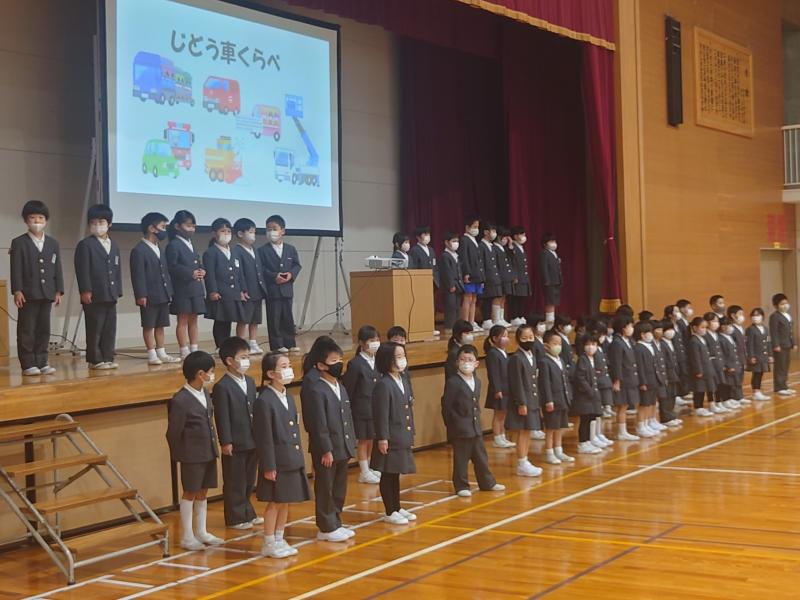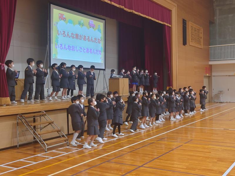 1月13日(木)の5限目に全校集会が行われました。今月は1年生が学年発表を担当し、国語の「じどう車ずかんをつくろう」という学習の中で分かったことを上手に発表しました。また、「はたらく車」のダンスをリズムよく元気に踊ってくれました。ステージに上がる前には、上着を丁寧にたたんで体育館の床に並べるなど成長の様子がたくさん見られました。
