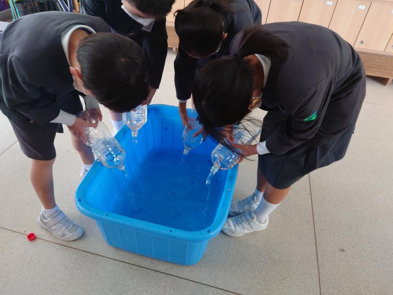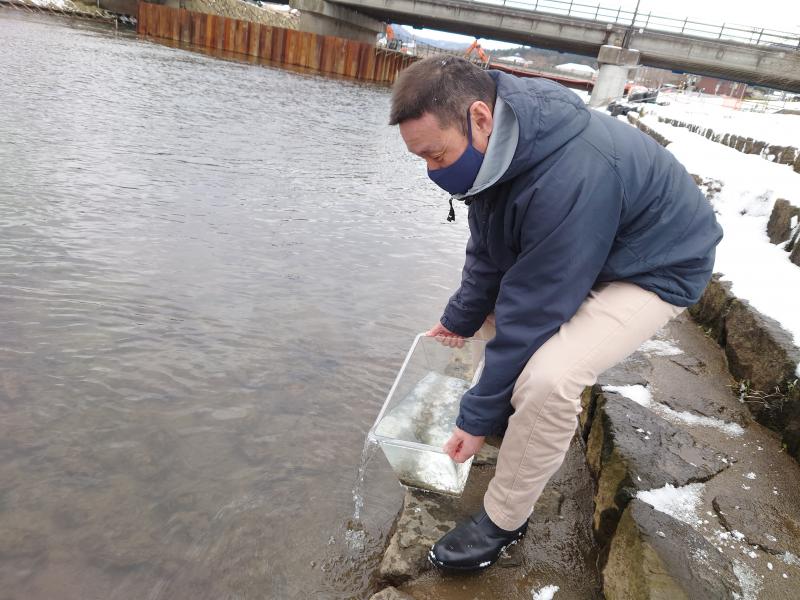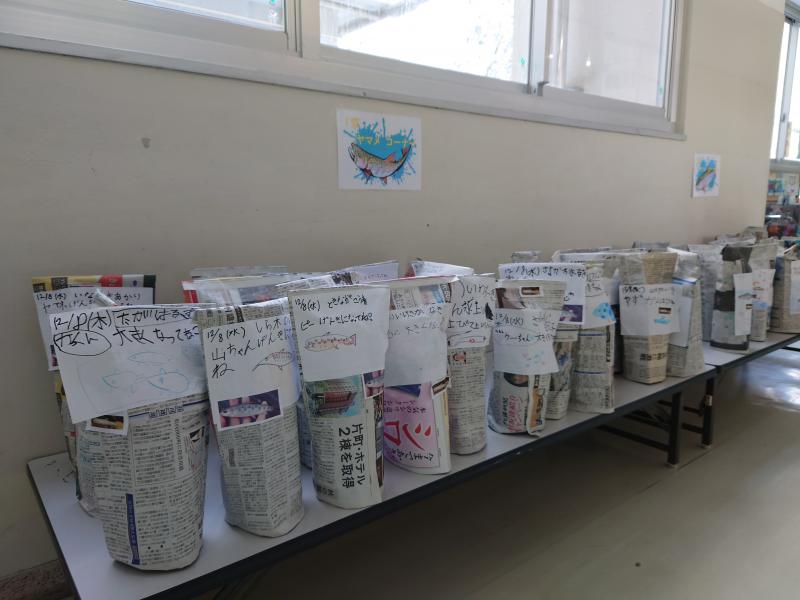 1月20日(木)に、12月から各学級で育ててきたヤマメの稚魚を放流しました。今年は天候が悪く、川まで放流にいくのは危険だったので、職員玄関のたらいに全校で育てたヤマメを集め、校務員の宮崎さんに代わりに放流していただきました。放流されたヤマメは元気よく川を泳いでいきました。