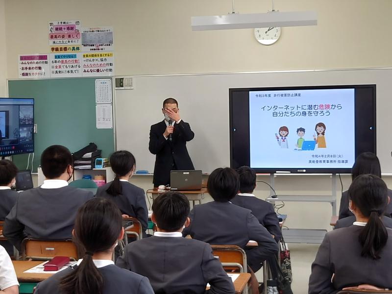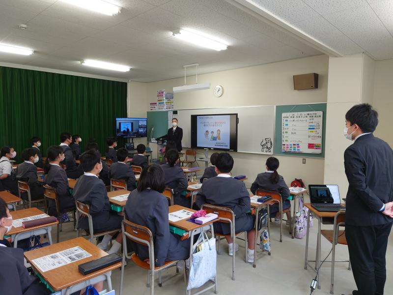 2月8日(木)の5限目に、非行被害防止講座を行いました。講師として、石川県教育委員会奥能登教育事務所の中村光宏指導主事をお迎えし、インターネットに潜む危険から身を守る方法について学習しました。具体的な事例をもとに、どこに危険が潜んでいるのかを考えたり、どのように自分自身の心と体を守っていくのかについて学んだりしました。河井小学校の「ネット端末の5つの約束」を守ることや、自分の意見や気持ちを正しく伝える大切さなどについて全体で確認しました。また、密を避けるため、6年教室で行われている講座をライブ配信し、5年生は教室で学習しました。