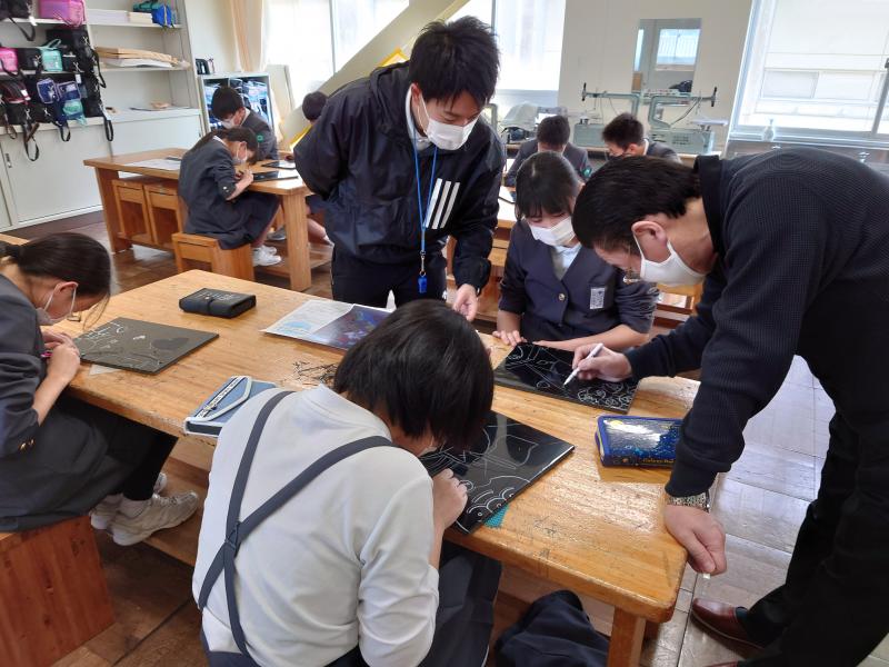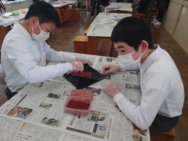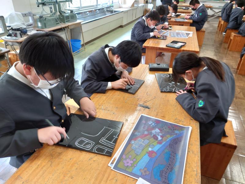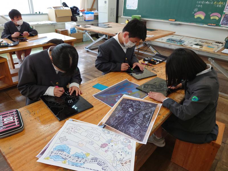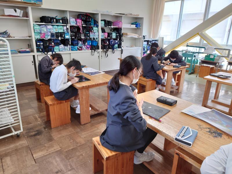 14日(月)の3・4限目に、卒業制作の彫りの作業を行いました。今年度も、沈金作家である前古孝人先生にご指導いただきながら、制作を順調に進めています。漆パネルには、6年生の思い出がたくさん詰まったデザインが施されており、6年生一人一人が役割を分担しながら、真剣に彫り進めていました。今回で41作目となる河井小学校伝統の卒業制作。今から完成が楽しみです。
