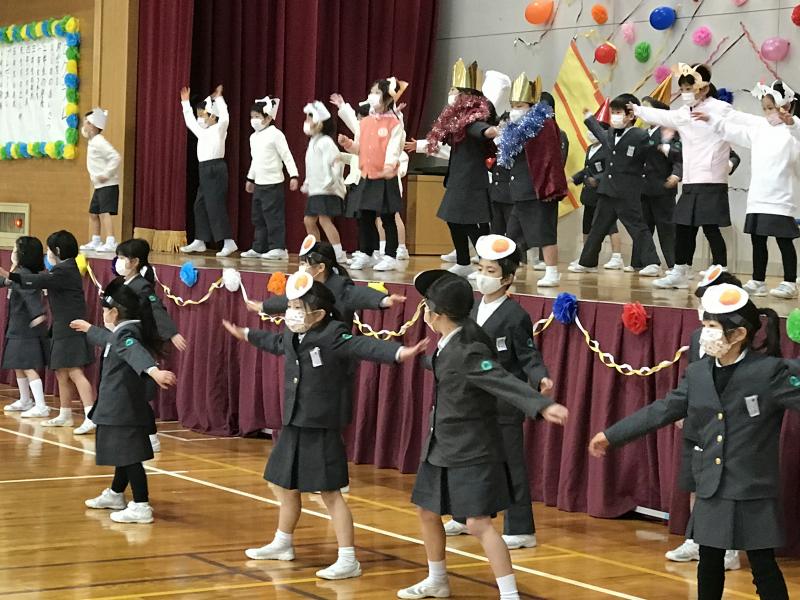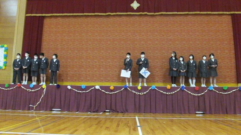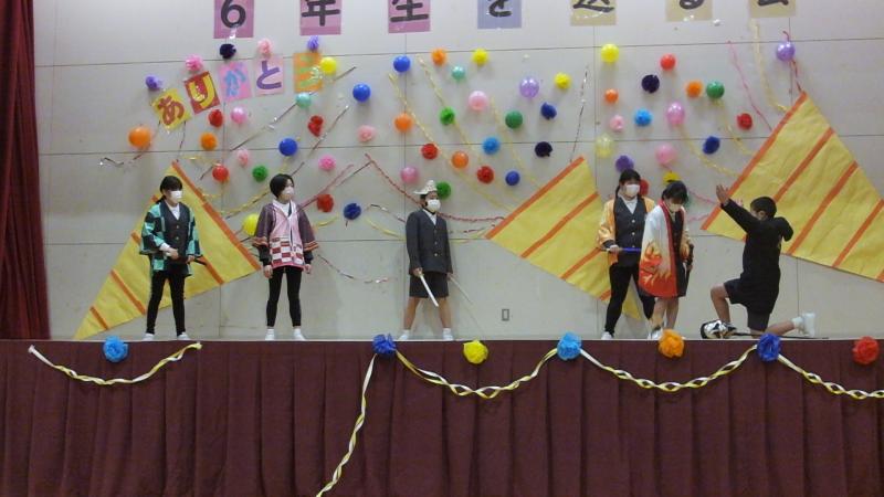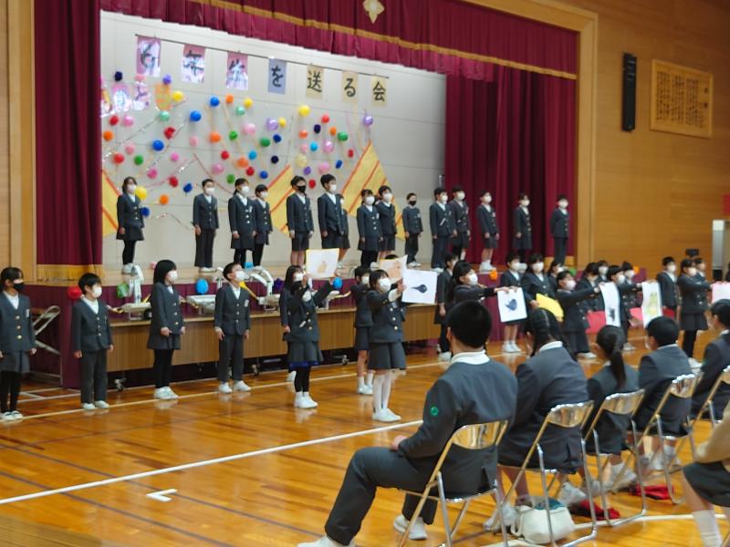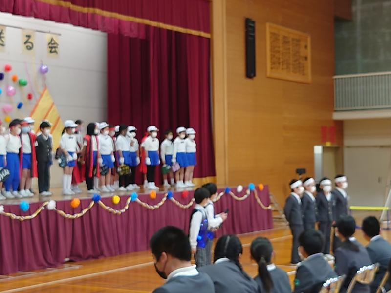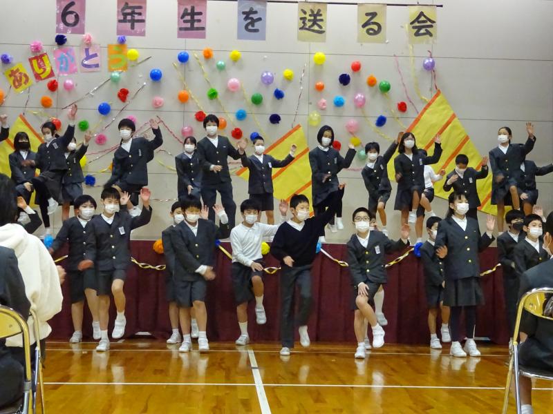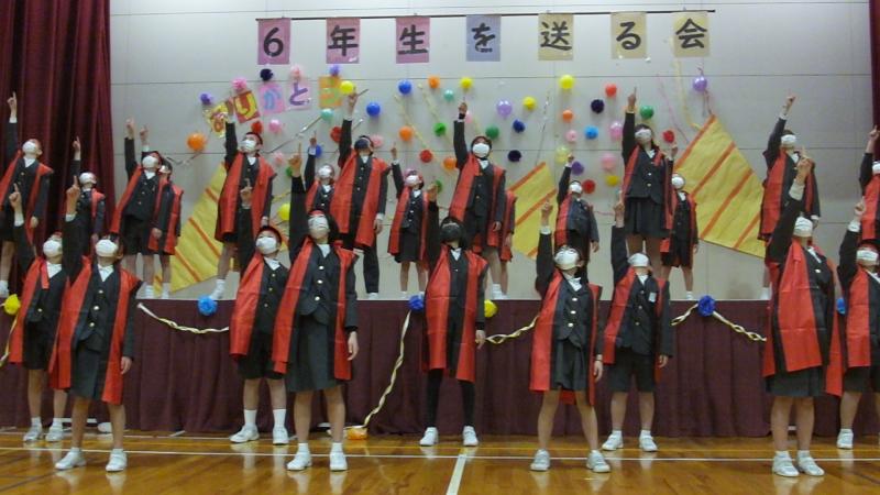 25日(金)の午後、6年生を送る会が行われました。今年度の6年生を送る会は、まん延防止等重点措置の期間であるため、感染症対策を講じてもなお感染リスクが高い学習活動とされるリコーダー等の管楽器演奏等を除いたブログラム編成としたため、例年行われている金管鼓隊の発表を中止しました。また、各学年においては、感染対策を実施しながら活動できる内容となるよう出し物をさらに工夫し送る会に臨みました。