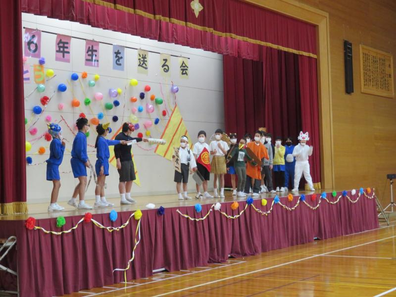 5年生は「桃太郎伝説MIX」というタイトル通り、いろいろな昔話を組み合わせた創作劇を考えました。5年生児童の発案で先生も参加する劇でした。大変ユーモアあふれる劇で会場を大いに沸かせていました。5年生は、会場準備や進行など、6年生を送る会の中心となって活躍してくれました。今後、学校を支える大きな力となってくれるでしょう。