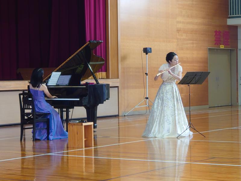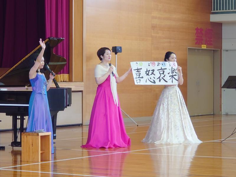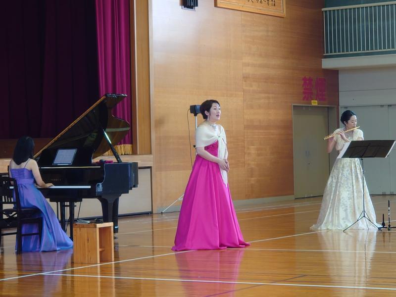 4日(木)は、3限目に学校コンサートを行いました。輪島市出身でオペラ歌手として有名な仲谷響子さんをお招きしてのコンサートです。また、今回のコンサートには、数々の受賞歴があり県内外でご活躍中のお二人、フルート奏者の多田由実子さんと、ピアニストの山田ゆかりさんにもご出演いただきました。