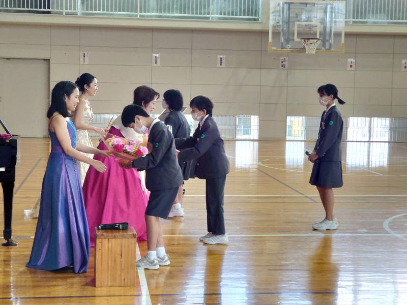 児童が楽器に興味をもったり、音を楽しんだりできるよう、フルートやピアノのソロ演奏や楽器に関するクイズなども織り交ぜながら構成を工夫していただきました。時間の過ぎるのがとても早く感じました。また、昨年5年生が合唱した「アラジンより~ア ホールニューワールド~」も歌っていただきました。体育館に響き渡る歌声は圧巻で、感動的な時間を過ごすことができました。最後に、6年生の櫻木佑圭さんがお礼の言葉を伝え、代表児童が花束を贈りました。仲谷響子さん、多田由実子さん、山田ゆかりさん、本当にありがとうございました。
