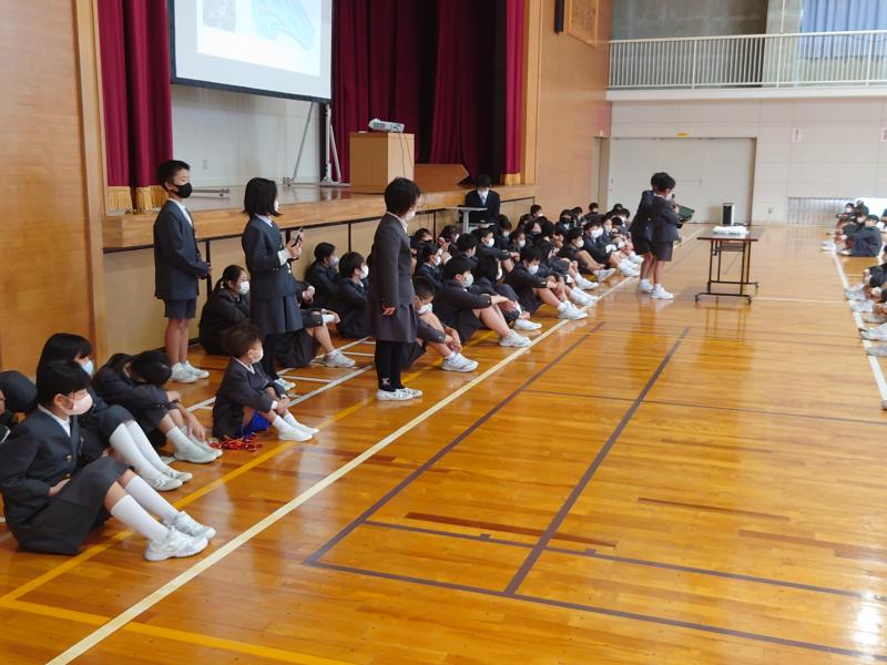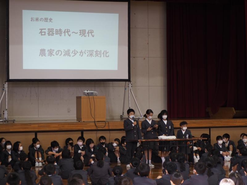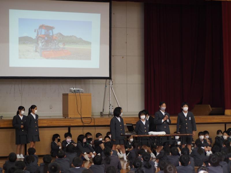 また、4年生が総合的な学習の時間を使って「お米」に関して様々な視点から調べたことを発表しました。クロムブックを使ったり、原稿を暗記したりして、発表内容がよく伝わるように工夫していました。お米と一言で言っても、その歴史や作り方、種類、田の環境、関わる生き物など様々な角度から追究できることがよく分かりました。児童一人一人の疑問を大切にすることで生まれた学びが全校に広がっていく素晴らしい発表会となりました。