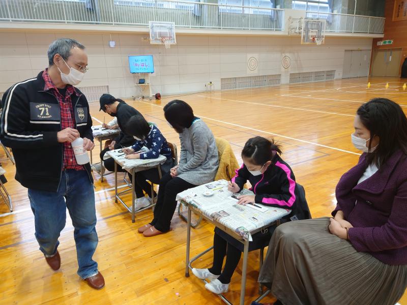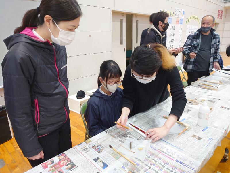 22日(月)に、4年生の親子ふれあい活動が行われました。今年度は、輪島蒔絵組合の方々にご協力いただき、箸づくりをしました。箸に思い思いの図柄をかいての蒔絵体験です。親子で協力して作りました。