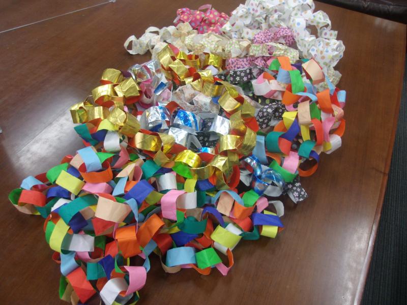 先日もお知らせしましたが、地域にお住まいの方に寄付して頂いた輪飾りを、ステージ前に飾らせて頂きました。丁寧な手作り作品で6年生を送る会を彩ってくれました。本当にありがとうございました。