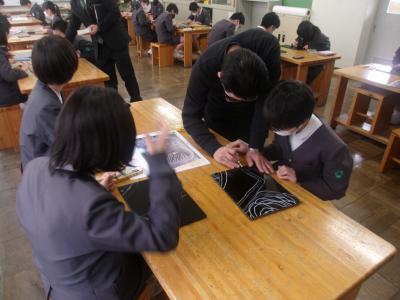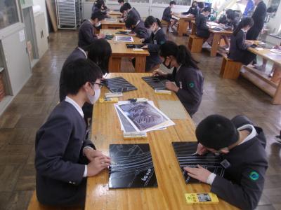 2月24日(水)沈金師 前古孝人先生にご指導頂き、本日より、今年度の卒業制作の彫る作業が始まりました。完成した下絵から、漆パネルへの転写は子どもたちの手で丁寧に行われ、いよいよ本日より彫る作業がスタートしたという訳です。児童は、それぞれ担当するパネルに真剣な眼差しで取り組んでいました。まさに一彫入魂です!3月の卒業式での披露に向けて、継続して作業を続けていきます。頑張れ!6年生!