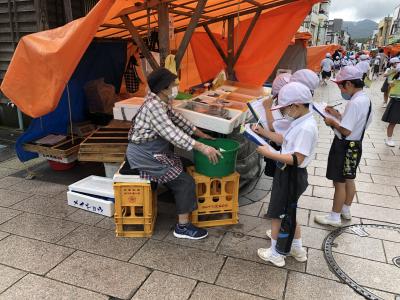 7月16日(木)1・2限に2年生は、朝市探検に行って来ました。梅雨の時期だったため、行けない日が続いていましたが、ようやく行くことが出来ました。待ちに待った朝市探検に、子どもたちは、ウキウキ笑顔です。朝市では、お店の人やお客さんにインタビューをしました。恥ずかしがらず質問している姿や一生懸命メモを取っている姿がとても素敵でした。国語科の学習で、メモの取り方をたくさん練習した成果が出ていたようです。
