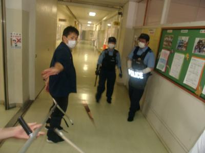 本日は、児童玄関から侵入した不審者(警察官変装)が校内に侵入しようとし、防犯カメラで発見した職員が対応するというものです。不審者を確認後、他の職員が刺股をもって加勢するという段取りです。担任は、教室の出入り口施錠封鎖と、教室出入り口の目隠しを行い、児童は、ひたすら静かに待機です。不審者役の警察官の迫真の演技に制止する側もかなり勇気が必要でした。輪島署に訓練110番通報を行い、警察官が制圧逮捕しました。警察官が来るまでの時間が非常に長く感じられました。本日の訓練でご指摘頂いたことを職員で再確認し、児童の安全を守りたいと思います。